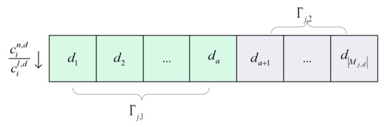 According to the preceding two lemmas, perform the following operations on downstream and uplink traffic flows. Downlink traffic flows are sorted in descending order by the ratio of the spectral efficiency of the normal subframe to LP-ABS. indicates the sorted traffic flow a. Figure 4 shows the sorted traffic flow. Given set , two business flow sets and are constructed. Uplink traffic flows are also arranged in descending order by spectral efficiency ratio, as shown in Figure 5.