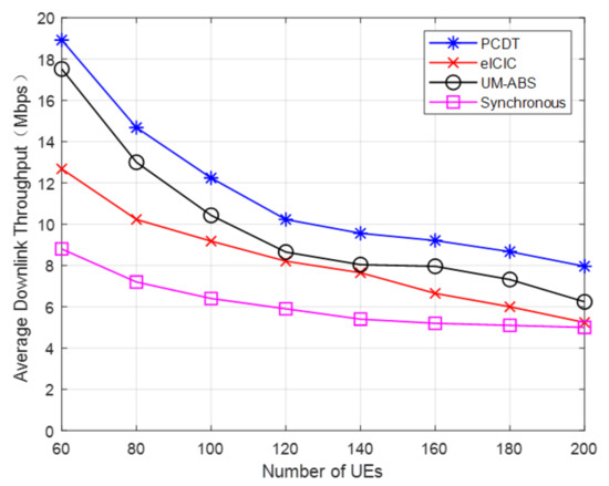 Figure 7 and Figure 8 evaluate the relationship between the average throughput and load of the downlink and uplink service flows. As shown in Figure 7, the PCDT algorithm can achieve better throughput performance than other algorithms in the downlink. The reason is that the interference mitigation mechanism is adopted in the PCDT algorithm. That is, the downlink transmission resources of HAPS are effectively used through the power control strategy. In addition, it can be seen from Figure 7 that the throughput performance of the eICIC algorithm is higher than that of the synchronization algorithm. This indicates that the performance gain of the ABS frame through interference avoidance is higher than the loss caused by the waste of resources.