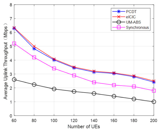 It can be seen from Figure 8 that the PCDT algorithm can achieve almost the same throughput performance as the eICIC algorithm in the uplink. This means that the PCDT algorithm proposed in this paper will not introduce additional severe uplink interference in the uplink. The reason is that the PDCT algorithm considers inter-link interference, which can avoid inter-link severe interference when allocating resources for users. In addition, due to the small number of uplink resources of GBS in the synchronization algorithm, the uplink throughput performance obtained by the synchronization algorithm is lower than that of the PCDT algorithm. The UM-ABS algorithm can obtain good throughput performance on the downlink. However, the UM-ABS algorithm does not reserve additional uplink transmission resources for GBS, and it ignores the downlink-to-uplink interference of GBS to HAPS. Therefore, the uplink throughput performance of the UM-ABS algorithm is the lowest among the four algorithms.