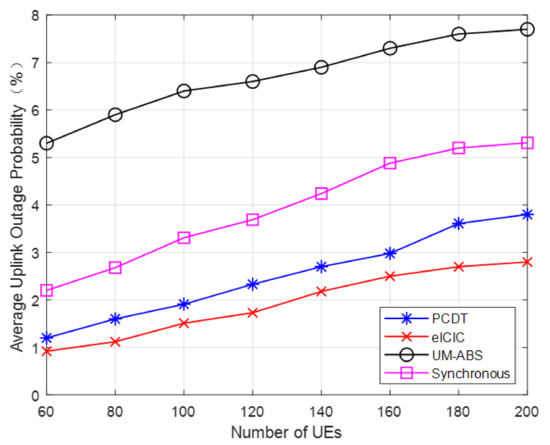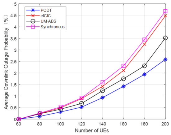Figure 9 and Figure 10 show the relationship curve between the outage probability of soft QoS service flow and the number of UEs. The outage probability is defined as the proportion of service flows whose achievable rate is less than the rate requirement in soft QoS service flows. It can be seen from the figure that the PCDT algorithm can obtain the lowest average outage probability in the downlink. The reason is that the PDCT algorithm tries its best to allocate resources to users so that the number of users meeting QoS can reach the maximum. In the uplink, the PDCT algorithm can achieve performance close to the eICIC algorithm. This is because although PDCT sacrifices some uplink resources, it makes up for them through the LP-ABS strategy. In summary, the PDCT algorithm proposed in this article can effectively improve the average throughput of uplink and downlink services and effectively reduce the outage probability of soft QoS services.