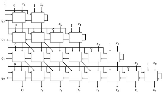 In particular, a non-restoring iterative square root circuit can be efficiently implemented in digital logic hardware using an array of Controlled Add–Subtract (CAS) cells, as shown in Figure 1. The detailed structure of a CAS cell is shown in Figure 2.