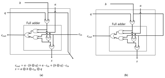Controlled Add–Subtract (CAS) cells used in a square root array circuit: (a) a cell in the middle portion of the array, (b) a cell in the rightmost position of each row.