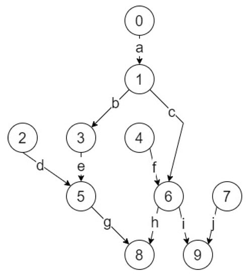To describe the scheduling problem of the metascheduler, we define an input model which consists of an application, platform and context model. The application model is a DAG, , where a vertex, represents job i, and the edge is a message m representing the communication between the jobs . Figure 1 illustrates an application model consisting of 10 jobs and 10 messages. The jobs are labelled 0–9 and messages a–j. A job has a computational cost which is the worst-case execution time , and each message has a message size .