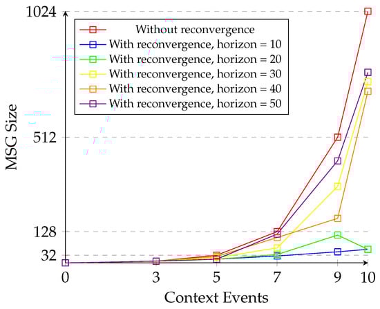 In Figure 7 and Figure 10, the reduction of the MSG is proportional to the reduction of the horizon in a consistent way across all context models. However, this is not the case in Figure 5, Figure 6, Figure 8 and Figure 9. In Figure 5, the plot for reconvergence horizon equal to 10 and 20 both present an output MSG size equal to 56 for 10 context events, respectively. The reconvergence of paths algorithm merges identical nodes when generated and terminates further exploration of the paths. This process results in cases where an increase in context events results in MSGs with smaller sizes if more “Deja Vu” nodes exist in the state-space, as observed by the green curve in Figure 5. In this case, for a horizon of 20, increasing context events from 9 to 10 results in an MSG of smaller size. Some reversed order in Figure 6 is also observed for 10 context events and horizon set to 40, which results in an MSG size of 550 being higher than when the horizon is set to 50 with MSG size equal to 446.