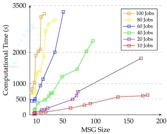 Figure 11 reports the computational times for MSG generation of Algorithm 2 with design parameters described in Section 5.2 and Section 5.3. MSG computational times are directly proportional to the average schedule generation time and the number of nodes in the MSG. However, as the number of scenarios increases, there is an exponential increase in the MSG size [2,6,8,11]. Existing techniques do not solve this exponential growth. Algorithm 2 computes MSGs within sufficient time, even for 100 jobs allocated to 4 homogeneous cores.