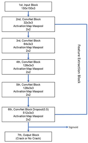To mitigate over-fitting and obtain superior generalization capability, we employed diverse artificial techniques to increase the size of the data set [87,88]. We heavily employed seven affine transforms methods as follows: (1) Rescaling: Before any processing commenced during training, we multiplied our data with a certain value. Our main image dataset comprises of RGB coefficients ranging between 0–255; because these values will be extremely high for our model to process, we set them to minimal values between 0 and 1 through rescaling operation (1/255. factor); (2) Rotation range: We randomly rotated each 40 × 40 image to180°; (3) Shift range: This technique randomly translates images horizontally or vertically. In the experiment, we used height and width shift range of 20% each, respectively; (4) Shear range: We used a shear range of 20%, which clips the image angles in a counter-clockwise way like radians. We zoomed each picture at the range of 20% each; (5) Flipping: Next, we flipped each image horizontally. Thus, there are 2551 samples for the cracked class, 1630 samples for the no-crack class, and 4181 belonging to the entire dataset. To obtain zero mean and unit variance, respectively, each pixel of the image was normalized in order to enhance training stability and increase the convergence speed [89].