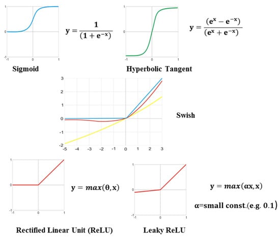 - The Convolutional Layer: This performs the two-dimensional convolution process on prior feature maps. Through the summation of one or more convolutional responses delivered from the pixel-wise activation function end, the output feature map’s activation occurs. Every single convolutional layer poses several filter kernels responsible for generating diverse output feature maps, and diverse feature representations can be extracted by the filter kernels, for example, the crossings, corners, and edges. We use activation functions of non-linearity after each convolution layer and the fully connected layer (FC) layer. Different varieties of non-linearity functions are applied to initiate non-linearity into CNN layers, and we deployed several types of them to test our model. These comprises of traditional conventional nonlinear functions, like sigmoid (hyperbolic tangent), swishmax, and rectified linear unit (ReLU) [74], which has been famous due its capability to drive fast training and simplicity. They are other variants of ReLU used for training and testing neural network models for improved accuracy, like parametric ReLU [75], exponential LU [76], leaky ReLU [77], and lastly a non-linear function known as sigmoid [78,79]. Examples are shown in Figure 2 below.