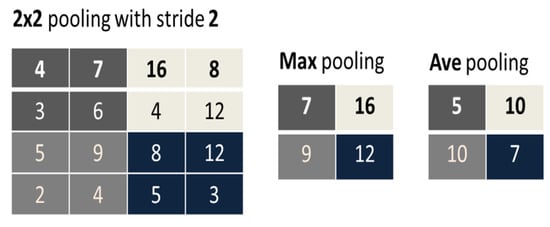 - The Pooling Layer: In order to reduce the dimensionality of feature maps, several computations are performed, and they are referred to as pooling. Operations involving pooling, which are performed in each individual channel in the network, make the network to be invariant to little shifts and distortions [70] and enhance robustness. Pooling operation pools combines a collection of values from various receptive fields to lesser amount of values. It can be set relying on the dimensions of their receptive field (e.g., 2 × 2) and max or average pooling operation, as shown in Figure 3. Pooling usually takes place on network blocks that are non-overlapping (that is to say, the size of the pooling equals the stride size). Normally, a stride that is larger than one is deployed in a manner that the dimensions of the representative feature map are reduced.