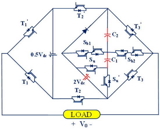 As the installation of renewable energy systems is gaining traction across the globe, the significance of multilevel inverters (MLIs) as dc-ac conversion devices is at its zenith [1,2]. Since many renewable power sources are composed of numerous low-voltage dc sources such as solar photovoltaic cells, ultra-capacitors, or battery storage systems, they are ideal for forming multiple connected dc-links. A similar case can be observed in hydrogen-based fuel cells investigated for use in high specific energy applications like onboard power systems [3]. MLIs can generate high efficiency and power quality dc-ac conversion at high voltage and high power levels. The reduced harmonic content, reduced individual device ratings and the filter size are some of the attributes of MLIs. Traditionally, MLIs were devised as cascaded H-bridge, flying capacitor and neutral point clamped configurations. Flying capacitor and neutral point clamped topologies have substantial capacitor counts with higher levels, leading to cost and reliability issues and capacitor voltage balancing requirements [4]. Since their inception, numerous evolved configurations have been developed to eliminate their setbacks. Furthermore, the later developed topologies outperform the three traditional topologies in component counts. Currently, researchers are developing MLIs with an application-based approach with fault-tolerance, modularity, efficiency and even weight and volume requirements in mind [5,6,7].