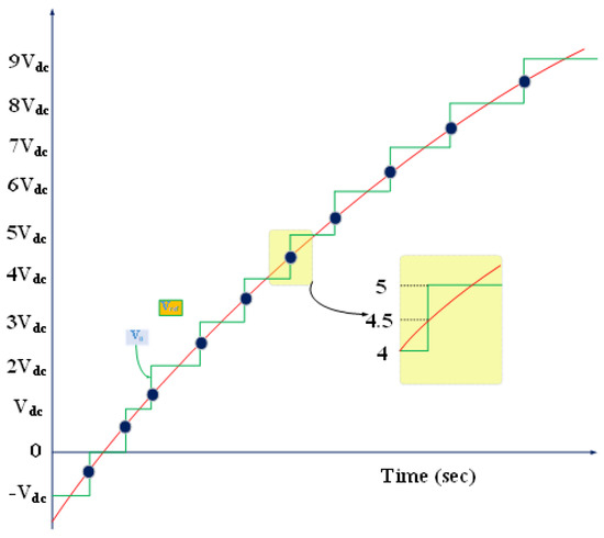 The modulation scheme is either low frequency-based (LS-PWM) or high-frequency carrier-based (CB-PWM). Modulation at low frequencies possesses the advantage of reduced switching losses, dv/dt ratings and snubber losses. Low frequency-based modulation techniques comprise the nearest level control (NLC) and the selective harmonic elimination (SHE) methods. The SHE approach is optimum for reducing the filter size but involves the solution of complex non-linear transcendental equations, therefore, being computationally more intensive. Additionally, NLC is more convenient for closed-loop controlled systems. NLC-PWM has been used in this work. The visual representation of NLC-PWM is depicted in Figure 3. The modulation index Ma is given as: