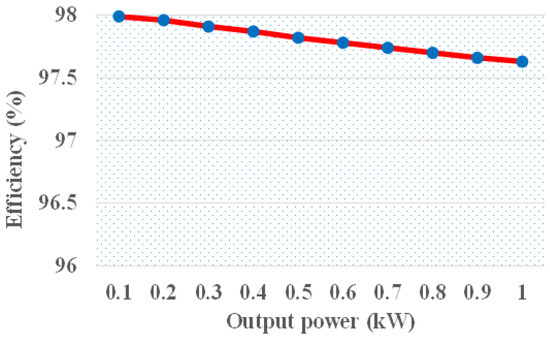 The PLECS platform was utilized for the thermal analysis of the SCMLI. The module IGW40N60H3, PG6DI capacitor is implemented with a peak voltage of 450 V. Figure 4 shows the conversion efficiency as compared to two previous topologies. The corresponding distribution of losses for loads is shown in Figure 5. As evident, the conduction losses are dominant due to low-frequency NLC PWM.