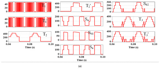 The proposed converter’s thermal loss model was developed to estimate the topology’s loss distribution across various components and efficiencies. The non-ideality in semiconductor components leads to conduction (PC) and switching losses (PS). In other words, power dissipation across ON-state resistance leads to conduction losses, and non-instantaneous transitions between ON and OFF states lead to switching losses. The total conduction loss in IGBTs and diodes is obtained using: