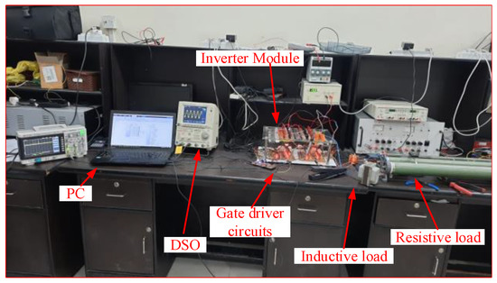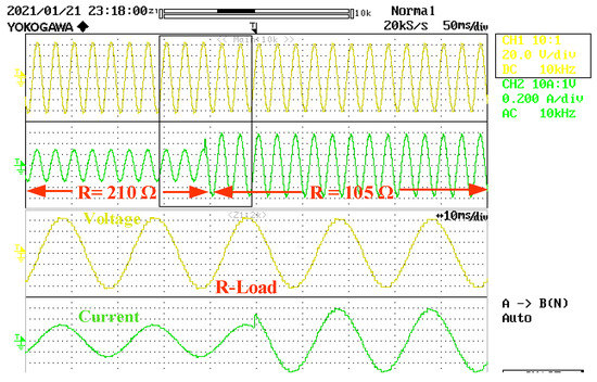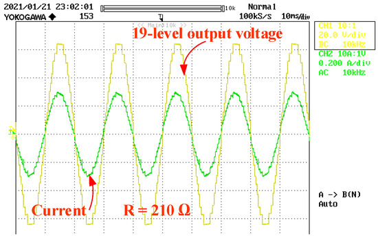 The laboratory prototype of the SCMLI topology is shown in Figure 8. The IGBT (IGW40N60H3) and PG6DI capacitors were used. TMS320F28335 DSP and TLP250H gate drivers were used for gating pulse control. A Yokogawa DL1640 oscilloscope was used to capture the resulting waveforms. A peak voltage of 63V at MI = 1 was created. Figure 9 depicts the 19-level load voltage waveform and current through a 210 Ω load. The voltage and current waveforms are in phase with similar wave shapes. The peak voltage and current values are 63 V and 0.3, respectively. Observably, the current lags the output voltage due to the inductive phase lag and is approaching a closer sinusoidal shape. To demonstrate the performance in dynamic conditions, R-load changes are also analyzed. The R-load changed from 210 Ω to 105 Ω, as shown in Figure 10. Additionally, waveforms during no-load to R-load transition are given in Figure 11. The harmonic profile of the 19-level waveform can be seen in Figure 12. The waveform has a THD of 4.3%, which meets EN50160 power quality standards and can eliminate filter demand due to minimal lower order harmonic content. The above results demonstrate the performance of the topology under varying operational requirements.