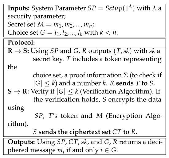 Rabin first introduced the OT concept by describing a situation where S sends a secret to R such that R has a 1/2 probability to receive it and S has no knowledge of what actually happened [10]. Then, Even, Goldreich, and Lepel proposed the “1-out-of-2” scheme () in which S sends two 1-bit secrets (, ), but only one of them is retrieved by R [11]. This simple idea has then been extended with the notion of ‘choice’, meaning that R initially communicates an hidden index (a ‘choice’ between and ) to S and, ultimately, S shall not be able to learn anything about that value [12]. Finally, Brassard, Crépeau, and Robert formalized a generalization called the “k-out-of-n” scheme (): S possesses n secrets and R wants to retrieve k of them simultaneously (with ) [13]. This specific generic protocol is detailed in Figure 1.
