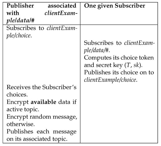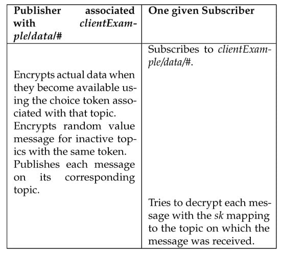 - Manage data availability: MQTT is based on the idea that a given data will be pushed as soon as available. However, to work correctly, the scheme requires all n types of data to be sent simultaneously as the Sender does not know what data are required by the other parties. A first solution consists of sending a given piece of data as soon as it is available considering that only the topic-intended Subscribers would try and be able to correctly decrypt the packet anyway. This might cause a privacy leak: the broker can still learn by observing what topic is active at a given moment and at which frequency (e.g., learn when a light switch is activated). Moreover, if a given Receiver switches off or unsubscribes right after receiving a given message, it is also possible to infer some information on that client’s initial choices, thus violating their privacy. Hence, the solution proposed here is to always publish to all topics by pushing real data on active topics, and random values on the others.