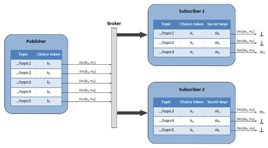 Figure 4 illustrates this model and highlights the importance of a Decryption Failure Prevention mechanism. and represent the encryption and decryption, respectively, of message using secret key . Let us imagine a situation where a Publisher P wishes to publish a message on an active topic, “…/topic3”. As suggested earlier, P encrypts messages for all possible topics using the token associated with topic3 and sends them to the broker. Let it be two Subscribers and , both interested in distinct subsets of data. Upon reception of the messages distributed by the broker, (respectively ) automatically discards all data linked to topics 4 and 5 (resp. 1 and 2). However, regarding the remaining messages, both Subscribers have no knowledge of the key used and, as a first naive implementation, will try to decipher each topic with its expected secret key. Failed occurrence will lead to the discarding of the data. This last point inherently brings forth two issues. Firstly, how can the subscriber detect that a given decryption failed? Secondly, trying to decipher each message causes unnecessary decryption overhead that should be particularly avoided in the context of resource-constrained devices.