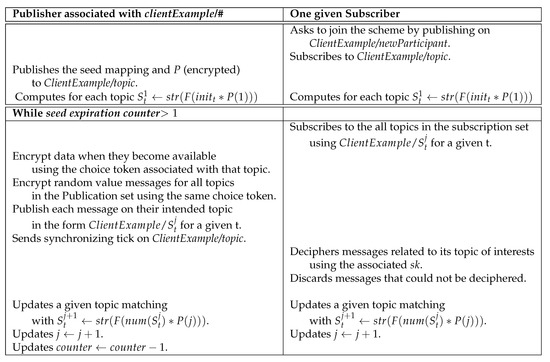 - Managing publication and subscription set: This model requires the subscription set to be constant during a loop (i.e., in the time span between two parameters resets), whereas the publication set can (and should) be recomputed at each send. This is due to the fact that, otherwise, Subscribers would need to compute several hashing values in a row to reach the current obfuscated name of topics it was not previously subscribed to. This constant behavior is a non-issue as the broker is unable to detect that pattern thanks to the obfuscation.