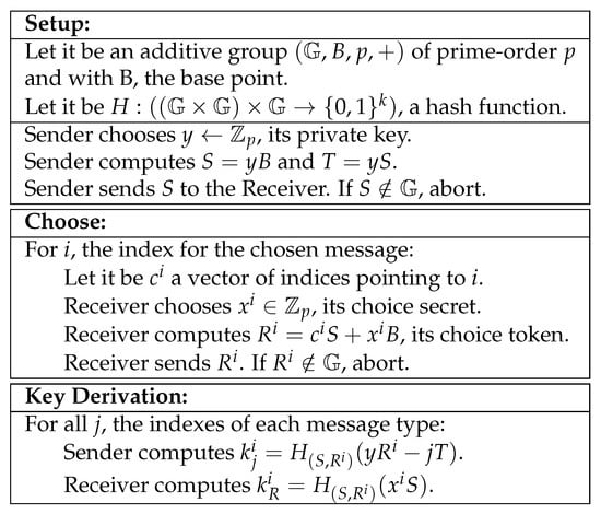 Additionally, a particular attention shall be given to the actual OT implementation. Indeed, in the theoretical protocol developed here above, all messages to be sent are encrypted with the active choice token, and a pre-deployed secret key on the Subscribers’ side enables decryption. However, please note that this particular generic OT construction is not practical as it requires all the secret messages to belong to , the order-q group on which the scheme is constructed (e.g., in [15]). As this fact implies the existence of an adequate strings-to-group-elements bijection, such construction is not applicable as is in the context of MQTT communications.
