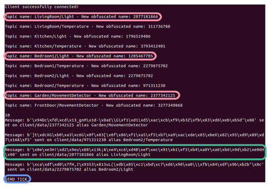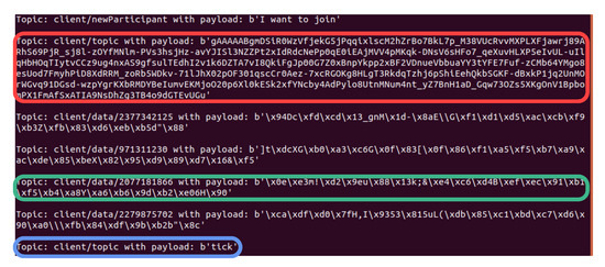 Finally, Figure 9 shows what a 3rd party observer (e.g., the broker) would intercept from that communication. In particular, please note that, on the one hand, the obfuscation parameters’ agreement is indeed encrypted and, on the other hand, thanks to the OT encryption, it is indeed also not possible either for the server to identify the active topic (see green box) from all other messages.