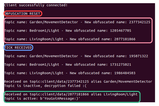 Furthermore, two observations are worth noting in Figure 8. On the one hand, as planned, this figure shows that the Subscriber was indeed only able to decrypt the message related to the active “client/LivingRoom/Light” topic, whereas its secretBox implementation raised a Description Failure for the inactive “client/Garden/MovementDetector”. On the other hand, this particular example illustrates a case where messages related to the first obfuscation arrive after the synchronizing tick and the next name computation. As expected and by keeping in their memory all previous name mappings, S was still able to correctly process the messages that arrived with a delay.