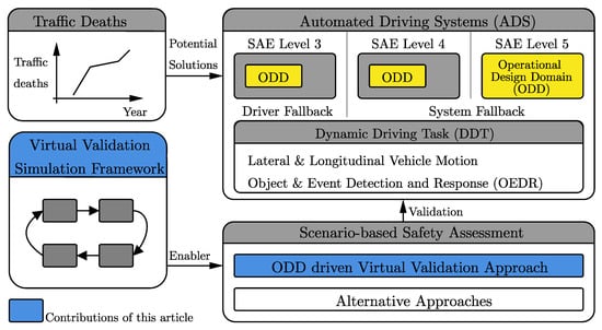In Figure 1, an overview of the relation between the concepts introduced in this chapter is given. ADS are seen as potential solutions for reducing the amount of traffic deaths. For the validation of such systems, a scenario-based safety assessment is a promising approach. Such approaches are enabled using appropriate simulation frameworks. In the following subsections (Section 1.1 and Section 1.2), the safety assessment of ADS as well as approaches for virtual testing are introduced.