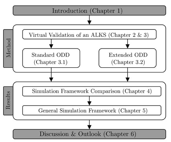 Section 2 introduces the approach for virtual validation regarding an ALKS in detail. This also includes an overview of the general simulation framework for virtual validation, including all relevant subsystems. Furthermore, both ODD versions for the ALKS are explained. In Section 3, both frameworks for the standard and an extended ODD are presented. Section 4 evaluates the results obtained for both ODD versions and frameworks. Section 5 introduces the concept of the layered simulation framework as a consequence of the two different ODDs that were analysed in Section 3. Furthermore, the interfaces are discussed in detail, including relevant parameters. Section 6 provides a discussion of the simulation results and the major contributions of this article. Additionally, future research areas are presented. An overview of the different chapters of this article can be seen in Figure 2.