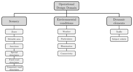 The concept of an ODD for ADS was first introduced by the SAE together with the taxonomy on automation levels as a definition under which conditions an ADS has to take over the DDT []. Although certain literature on defining the ODD for particular aspects (e.g., best practices, definitions for specific studies) exists [,,,], currently there is only one specification for an ODD taxonomy available []. The taxonomy uses the scenery (e.g., drivable area), the environmental conditions (e.g., weather), and the dynamic elements (e.g., traffic) as the main categories. Furthermore, it is used as a basis for developing an international standard regarding an ODD taxonomy []. The proposed ODD structures, including categories and subcategories, can be seen in Figure 3.
