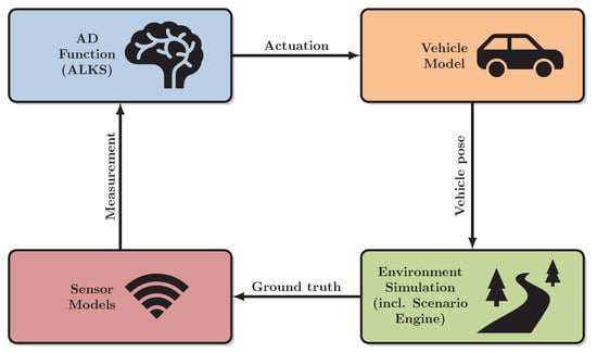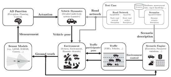 Current literature suggests that virtual testing using simulation plays a dominant role in future safety validation processes for ADS, as it provides scalability. However, major challenges are associated with the increasing complexity of integrating all necessary subsystems into a complete simulation framework. Furthermore, such a virtual test environment depends on the simulation’s scope and goals and the tested system. In general, a generic ADS can be seen as concatenation of the four subsystems sensing, perception, planning and control. Those four subsystems perceive the environment with respective sensors (sensing), interpret it (perception), and output a perceived environment to the planning subsystem. This perceived environment can consist of an object list (dynamic and static objects in the environment) and other types of information (e.g., lane markings). Based on this, a certain target actuation is defined by the control subsystem using a trajectory as an input []. Hence, it is also possible to use a simulation to only test certain subsystems—e.g., the perception based on pre-recorded sensor data. However, for a general safety assessment of ADS, the complete chain of ADS subsystems must be in effect. Therefore, the real environment is exchanged with a virtual one. As this serves as an input to the sensing subsystem, the virtual environment needs to be able to represent the necessary elements affecting the respective sensors. As a replacement for the actual sensor hardware, sensor models are introduced. They simulate actual sensor behaviour based on the input from the environment simulation. Sensor models either output raw data (e.g., point clouds) as an input for the perception subsystem or object lists. In the case of the object list output, certain tasks of the perception subsystem are already accomplished inside the respective sensor model. This could be the case if specific sensors are modelled, where the real hardware also directly outputs object lists instead of raw data streams. An overview of the current state of the art regarding sensor models can be found in []. Finally, the simulation loop is closed by integrating the vehicle dynamics; it then updates the position of the ego vehicle in the virtual environment. This environment simulation is usually controlled by a scenario engine using scenario descriptions as inputs.