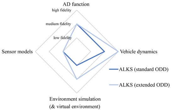 Before the actual implementation of the simulation framework for the virtual validation of an ALKS, as presented in Section 3, the concrete requirements for each subsystem are derived from the defined ODD. This includes the standard ODD (green area of Figure 4) as well as the extension towards a lane offset (grey area of Figure 4). The requirements for the four main subsystems, as presented in Figure 5, are displayed in Table 4. For the AD function, the mentioned subcategories are based on []. The tactical and operational manoeuvres and the relevant event and response pairs of the object and event detection and response (OEDR) (which is a subtask of the DDT; see []) are crucial not only as requirements for the function itself but also for the other subsystems. The possible manoeuvres of the function have a direct influence on the fidelity of the vehicle dynamics model. In the case of the standard ODD, the implemented vehicle dynamics require a dynamic model that takes the friction between the road and tires into account. For the extended ODD, as more challenging lateral manoeuvres are possible, a model displaying the car’s lateral behaviour is required. In contrast, the ability to detect and react to vehicles in front leads to necessary capabilities for the sensor models. Based on the UN regulation for ALKS presented in [], very concrete requirements for the virtual environment are derived. First, lane markings are required, as they define the feasible space for the ADS. As a direct consequence, this means that roads, including respective lanes, need to be included in the virtual environment. Secondly, as other traffic participants are part of the ODD, they need to be represented virtually. Additionally, the roads included in the virtual environment need to be georeferenced if they are derived directly from the real world and not generated generically. This means the road sections that are part of the virtual environment have the exact same longitudinal and lateral coordinates as their respective real-world sections. Therefore, real-world measurements from this section can be directly used in simulations—e.g., to perform cross-validation checks. Most importantly, the sensor model subsystem needs to respect the potential occlusion of traffic participants (induced either by other traffic participants or the static scenery) and needs to have a 3D field of view (FOV) in which the respective traffic participants are detected. These requirements are a direct consequence of the OEDR capabilities. They lead to specific traffic scenarios (e.g., cut in or cut out) where both mentioned requirements are essential.