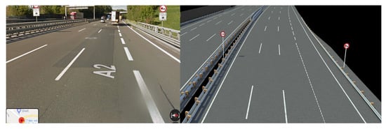 For the virtual environment, the baseline was the ASAM OpenDRIVE® map from the A2 motorway near Graz, Austria (see []). The map was imported into the tool RoadRunner from Mathworks®; see Figure 8. The tool provides an interactive editor and the ability to design 3D scenes for ADS testing. Most importantly, it enables the generation of a 3D environment using an ASAM OpenDRIVE® map as a basis. The RoadRunner tool has an exporting option specifically for the open urban driving simulator CARLA [], which was utilised, as CARLA was the tool of choice for the virtual environment. Furthermore, the Python-based library scenario_runner [] was used as well, as this is the implementation of a scenario engine capable of interpreting ASAM OpenSCENARIO® files and executing the respective scenario directly in CARLA. The library was slightly adapted to enable the correct interpretation and execution of the scenarios described in Section 4. The exported 3D model of the virtual environment based on the provided ASAM OpenDRIVE® map was then imported using CARLA’s pipeline to generate virtual environments. Thereby, both the 3D model and the ASAM OpenDRIVE® are needed to create a usable CARLA map, as the navigation of traffic agents in CARLA (and various other pieces of information such as the road and lane identifiers) are directly extracted from the underlying road network description. Generally, this virtual environment is much more detailed than would have been necessary based on the requirements of the ALKS (compare the required model fidelity in Figure 7), since the implemented sensor models are all operating on an object list level. However, this can be seen as an intermediate step. Once medium- or high-fidelity sensor models are introduced into the framework, more detailed information from the virtual environment during runtime is necessary.