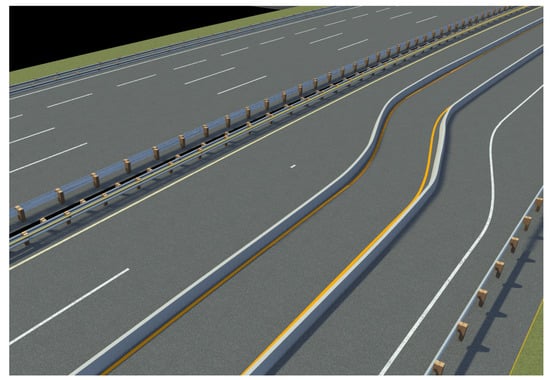 The virtual environment is alternated compared to the one used for the ALKS with the standard ODD, which directly reflects a real-world motorway section. For the extension of the ODD, the virtual environment was adapted using the Mathworks®-RoadRunner tool. The tool enables introducing a lane offset, similar to a typical situation presented by construction work on highways, which influenced not only the 3D model but also the underlying road network (ASAM OpenDRIVE®). The altered virtual environment can be seen in Figure 9. As this requires the adaption of the original ASAM OpenDRIVE®, ideally using a relevant tool, the needed virtual environment for this extended ODD is classified as being medium-fidelity.