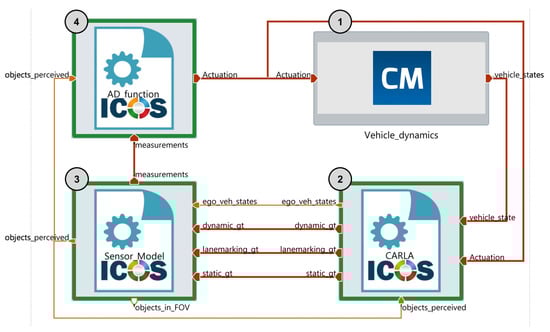 Table 6 shows the complete test case description, including all relevant parameters, that were chosen for the simulations. The co-simulation is parametrised with the calculation step sizes of all subsystems and the coupling step size in between models. Furthermore, zero-order hold (ZOH) is chosen as a simple coupling algorithm for extrapolating the input from the last to the first subsystem (in terms of execution order). The execution order of the subsystems is displayed in Figure 10 as numbers in the top left corner of the respective model blocks. The sequence starts with the vehicle dynamics subsystems and then calculates sequentially in clockwise order. For the sensor model subsystem, all relevant parameters of the two implemented sensors are stated, including orientation, range and FOV. The vehicle dynamics are defined stating the used software (and version). Additionally, the used vehicle configuration, which is part of the standard software package, is displayed. In the Python-based vehicle dynamics, the equivalent configurations of all applicable parameters are chosen. Furthermore, the target velocity is defined as an AD function parameter for both ODD cases.