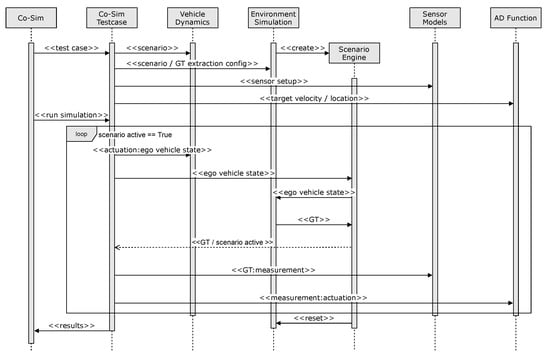 Sequence diagram of the implemented co-simulation framework for the virtual validation of ADS.