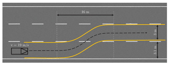 Considering that the ego vehicle has to go through much more lateral motion for the extended ODD considering the already described lane offsets, only a high-fidelity vehicle dynamics model can fulfil these requirements. Therefore, the software IPG CarMaker, which provides realistic behaviour to the limits of vehicle dynamics, was implemented in the framework for the extended ALKS ODD. It has an efficient implementation of a multibody system, which is non-linear and real-time capable []. Furthermore, it gives access to various pre-defined models for passenger vehicles, suitable for simulation studies as conducted for this article. Additionally, it is possible to import ASAM OpenDRIVE® maps for the road layout. This is an essential requirement, as it allows for the same road layout in both the vehicle dynamics tool and the virtual environment.
