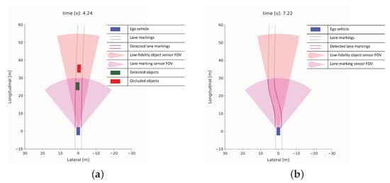 For the sensor models necessary for object detection, a low-fidelity implementation was used that is based on []. The implementation was carried out in Python. Only the calculation of the occlusion between traffic participants and other parts of the virtual environment was developed in C++, as this is associated with a high computational effort. This sensor model takes a ground truth object list as an input and outputs the respective detected objects inside the 3D-FOV. The FOV can be adjusted for its range and opening angle (in two dimensions). For the lane markings, an Intel Mobileye®-like sensor was implemented, as briefly explained for the perception-based ALKS version in Section 2. For that, points along the lane markings of the dedicated lane in the virtual environment are extracted during runtime and provided as input to the sensor model. Using this input, the model calculates the coefficients and domains of cubic polynomials, modelling the left and right borders. for the left and right borders. The perception block of the AD function uses this information to reconstruct the drivable area for the vehicle in consecutive time steps.