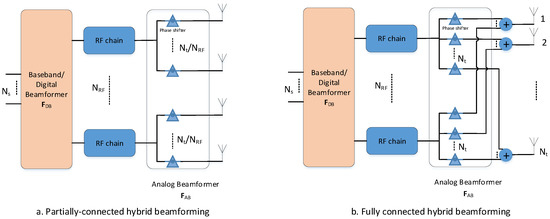 The beamforming architecture is mainly divided into digital beamforming, analog beamforming, and hybrid beamforming [8]. In digital beamforming, amplitude/phase shift keying is applied to the digital signal (digital to analog converter (DAC)) at the transmitting end. The opposite process is done after analog to digital converter (ADC) and digital downlink converter (DDC) operations; digital beamforming includes RF translators, A/D conversion, DDC, complex weight multiplication, and a summing function. In comparison to digital beamforming, analog and hybrid beamforming architectures can minimize the number of RF chains by combining analog or mixed analog-digital signal processing. In particular, analog beamforming is usually implemented using phase shifter networks and is one of the simplest ways to apply MIMO in mmWave systems. However, its performance is affected by the quantitative phase shift and lack of amplitude matching. Hybrid beamforming (HB) combines analog and digital beamforming; it uses each benefit and may acquire excellent stability among system complexity and overall performance by accurately deciding on various RF chains. Hybrid beamforming is classified into partially connected HB architectures and fully connected architectures, as shown in Figure 1. The partially connected HB uses a separate subset of a phase shifter and antenna array with each RF chain. Because of the structure, this is also called sub-array hybrid beamforming. In fully connected HB architecture, the RF beamformer of each RF circuit uses all antennas; this is where the RF signals from various RF circuits are combined before being sent through the antennas. Due to the architecture, this type is also called full array HB [9]. In a fully interconnected architecture, additional RF aggregation components can cause failures and performance losses, and it is one of the main problems of mmWave radio. On the other hand, the partial connection architecture of the RF chain allows fewer antennas to be accessed, which leads to severe shortcomings such as large beam widths, fewer directions, and significant interference from other chains. They try to reduce the interference to the partially connected HB type. The partial connection architecture provides a simpler circuit and lower loss than the fully connected architecture [6,9]. The fully-connected structure provides a more significant array gain.