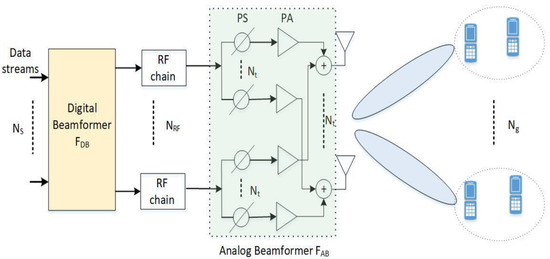 The huge demand for various services and the rapid growth of mobile Internet and Internet of Things (IoT) applications have led to research on fifth-generation (5G) communication systems [1]. There are two prominent frequency bands in 5G communications: the millimeter wave (mmWave) frequency band and the sub-6 GHz frequency band. By operating at 30–300 GHz, mmWave communication may provide orders-of-magnitude higher bandwidths than sub-6 GHz band communication. Hence, the fifth-generation (5G) wireless communication requirement for high throughput motivates the wireless industry to use mmWave communication for its vast bandwidth advantage [2]. Aside from the wide bandwidth, the smaller wavelengths in mmWave allow more antennas to be packed into the same physical space, allowing vast multiple-inputs multiple-outputs to be supported more effectively in mMIMO [3,4]. This also introduces spatial multiplexing and diversity gains. In fact, it has been shown that mmWave-mMIMO can increase system capacity by orders of magnitude [5].