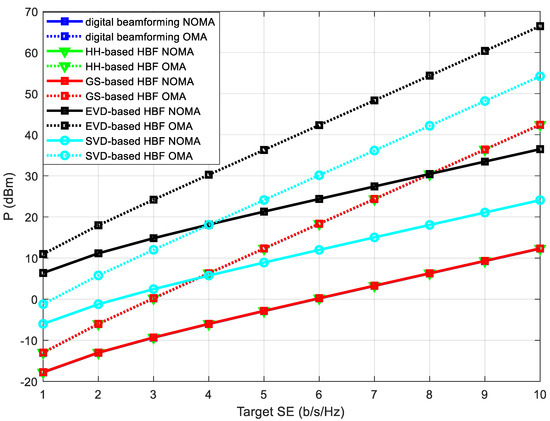 The suggested low complexity hybrid beamformer based on the Householder function (HHHBF) is assessed in this section. The proposed scheme is compared with the Gram–Schmidt-based hybrid beamforming (GSHBF), eigenvalue decomposition-based hybrid beamforming (EVDHBF), and singular value decomposition-based hybrid beamforming (SVDHBF) in terms of transmit power performance against the target SE. The digital-only beamformer for both NOMA and OMA are also included in the graphs as a benchmark.