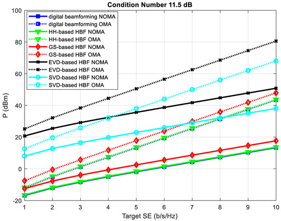 Figure 3 depicts the transmit power required to achieve the desired target SE in a well-conditioned massive MIMO channel. The required transmit power increases with the increasing target SE. The dotted-line graphs are for various OMA schemes, and the solid lines are for the NOMA schemes. It can be seen that all NOMA have low power consumption as compared to the respective OMA schemes for a target SE. It can be noted that in the well-conditioned channel, GS-based NOMA and HH-based NOMA give an identical performance; because both GS and HH are channel orthogonalization based analog beamforming methods. The HHHBF and GSHBF give similar performance to that of the digital beamformer. The HHHBF performs better in the ill-conditioned channel condition due to its low orthogonality errors than the GSHBF method, as shown in Figure 4.