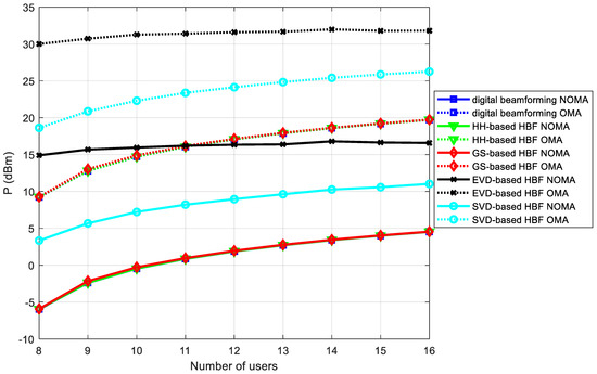 Figure 5 shows the transmit power required with the increasing number of users when the target SE is 5 bits/s/Hz. It can be seen that HH-based HBF NOMA provides 15 dBm gain over the corresponding HH-based HBF OMA scheme. We take the number of users from eight to sixteen in order to show the effect of the OMA (when K = 8) to two users per group NOMA (when K = 16). As the number of users increases, the required transmit power to maintain the target SE is not increased linearly because of the users’ diversity gain. Again, both GS-based and HH-based schemes are showing an identical performance in the well-conditioned massive MIMO channel, which is similar to the optimal digital beamforming.