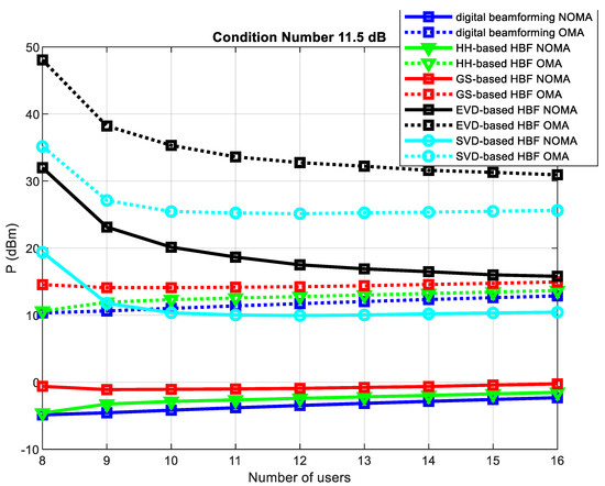 In Figure 6, the required transmit power is plotted against the number of users in the ill-conditioned massive MIMO channel with the target SE of 5 bits/s/Hz. The NOMA digital beamforming has the lowest transmit power for all users. The proposed HH-based HBF NOMA scheme has a better performance and low transmit power than the GSHBF NOMA scheme due to low orthogonality error with sparse and ill-conditioned channel matrix. HHHBF also provides a minimum performance gap with the ideal digital beamforming.