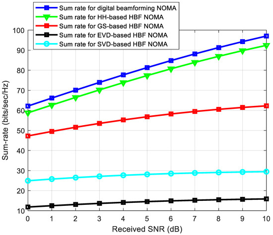 Finally, we plot the average sum-rate with the received SNR in the ill-conditioned channel in Figure 7. Sum-rate is the logarithmic function of the received SNR. The SVD- and EVD-based HBF NOMA schemes produce a low sum-rate performance because common scatterers in the mmWave channel result in a similar angle-of-arrival at the BS and cause severe interuser interference. However, the channel orthogonalization based HBF (GS-based and HH-based) eliminates the interference in the analog beam domain. In the case of the real-world ill-condition channel, the HHHBF NOMA outperforms the GSHBF NOMA because of the low orthogonality error in the analog domain. It can be seen that the proposed HH-based HBF NOMA produces a 1.48 times better performance than the GS-based HBF NOMA at 10 dB received SNR.