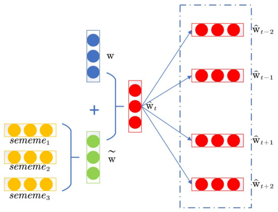 For word w, this paper presents the surrounding nodes (context words) obtained in the algorithm as and will jointly train the embedding vectors of words and sememes, as shown in Figure 2. The loss function of the extended model is derived from the loss function of Skip-gram, that is, the conditional probability of nodes around the target word is calculated by Equation (1):