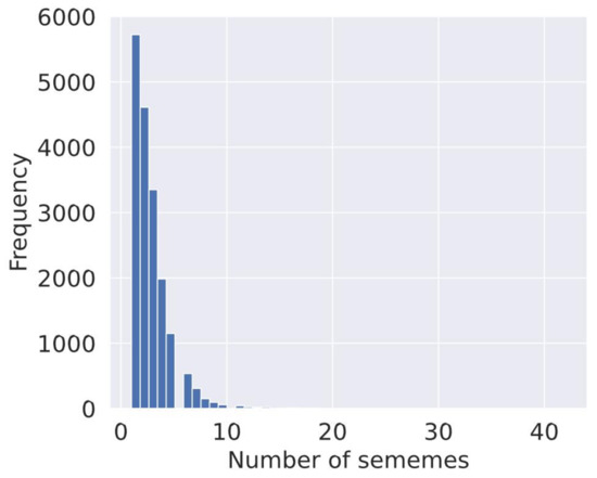 The distribution of sememes in the dataset is shown in Figure 3, in which the horizontal coordinates indicate the number of sememe annotations of a word in HowNet, and the vertical coordinates indicate the frequency of the word. According to the figure, most of the words were interpreted by 1–5 sememes, and very few words were interpreted by more than 10 sememes.