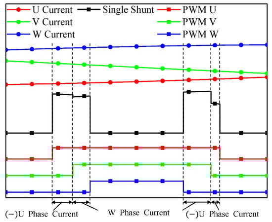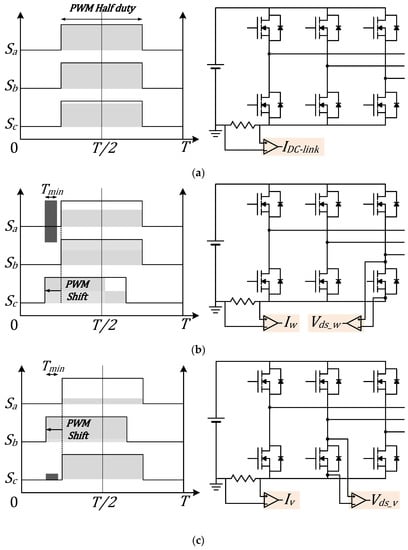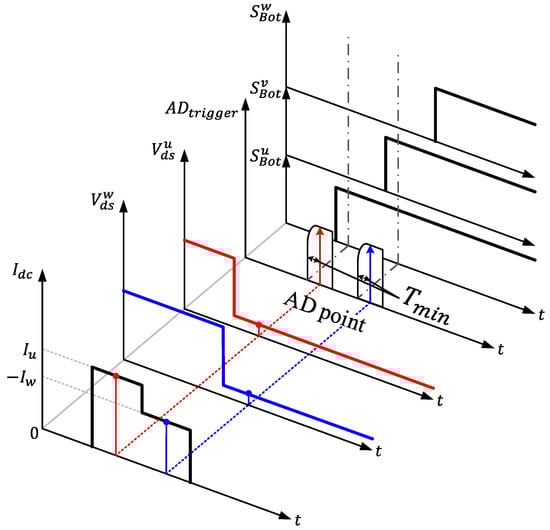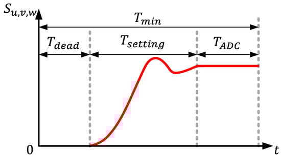 Tdead is the dead time, Tsetting is the PWM ON steady-state arrival time, and Tadc is the ADC operation time. A limitation is that the time taken to detect the current in the single-shunt resistor inverter should be longer than the Tmin defined in Equation (1). If the Tmin is not secured, it is impossible to detect the current with the shunt resistor. Equation (1) varies depending on the experimental situation or MCU type and setting, but the Tmin time is usually about 2~3 us. It takes about Tdead (1~2 us), Tsetting (300~600 ns), and Tadc (200~400 ns).