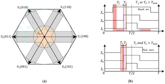 Current undetectable region in single-shunt resistor inverter; (a) Current undetectable region in voltage vector; (b) PWM in band area and PWM in star area.
