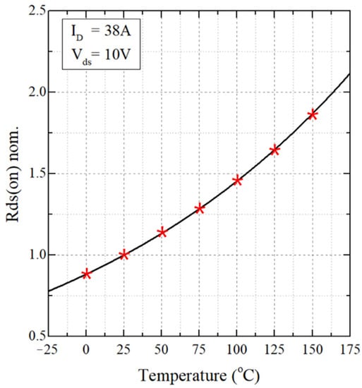 It is generally known that Rds(on) is not constant. In order to accurately determine Rds(on), it is necessary to evaluate the dependence on the junction temperature, Tj. In the MOSFET MTI145WX100GD data sheet [32] that was selected in this paper, there is a graph of Rds(on) as a function of temperature. This is shown in Figure 7, and points marked with * are extracted from the curve and summarized in Table 1, where Rds(on) nom represents the normalized MOSFET resistance.