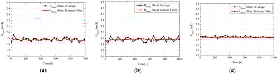 In this paper, the accuracy of the estimation of Rds(on) was improved by designing a Kalman filter. The state equation and measurement equation of the measured Rds(on) were the same as those shown in Equation (3). Since the measurement of Rds(on) was directly measured rather than expressed as an expression through a differential equation for the measured value, matrix A and matrix H could be defined as identity matrices. In principle, matrix Q and matrix R should be constructed by accurately reflecting the characteristics of noise, but there is a limit to their analytical determination because various errors are compounded (Ref. [31]). Therefore, in this paper, matrix Q and matrix R values were selected through experimental analysis. The results according to the experiment are shown in Figure 10. In this paper, the optimal value was selected and experimentally corrected. Additionally, the initial Rds(on) was based on the data sheet value (1.7 mΩ).