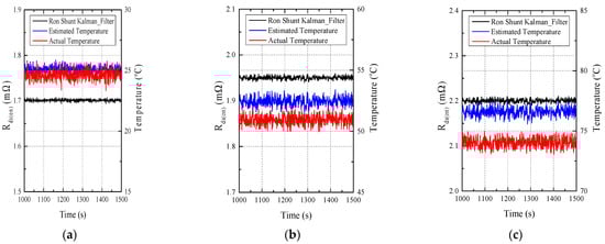 (a) Measured temperature, estimated temperature, Rds(on) at 25 °C; (b) Measured temperature, estimated temperature, Rds(on) at 50 °C; (c) Measured temperature, estimated temperature, Rds(on) at 75 °C.