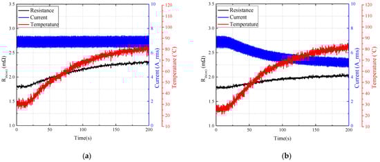 The initial value was measured in the same way as above, as shown in Figure 10; it was measured by being sampled 1000 times in 0.1 s. The initial value of Rds(on) at 25 °C of the MOSFET (MTI145WX100GD) was determined to be 1.7 mΩ.
